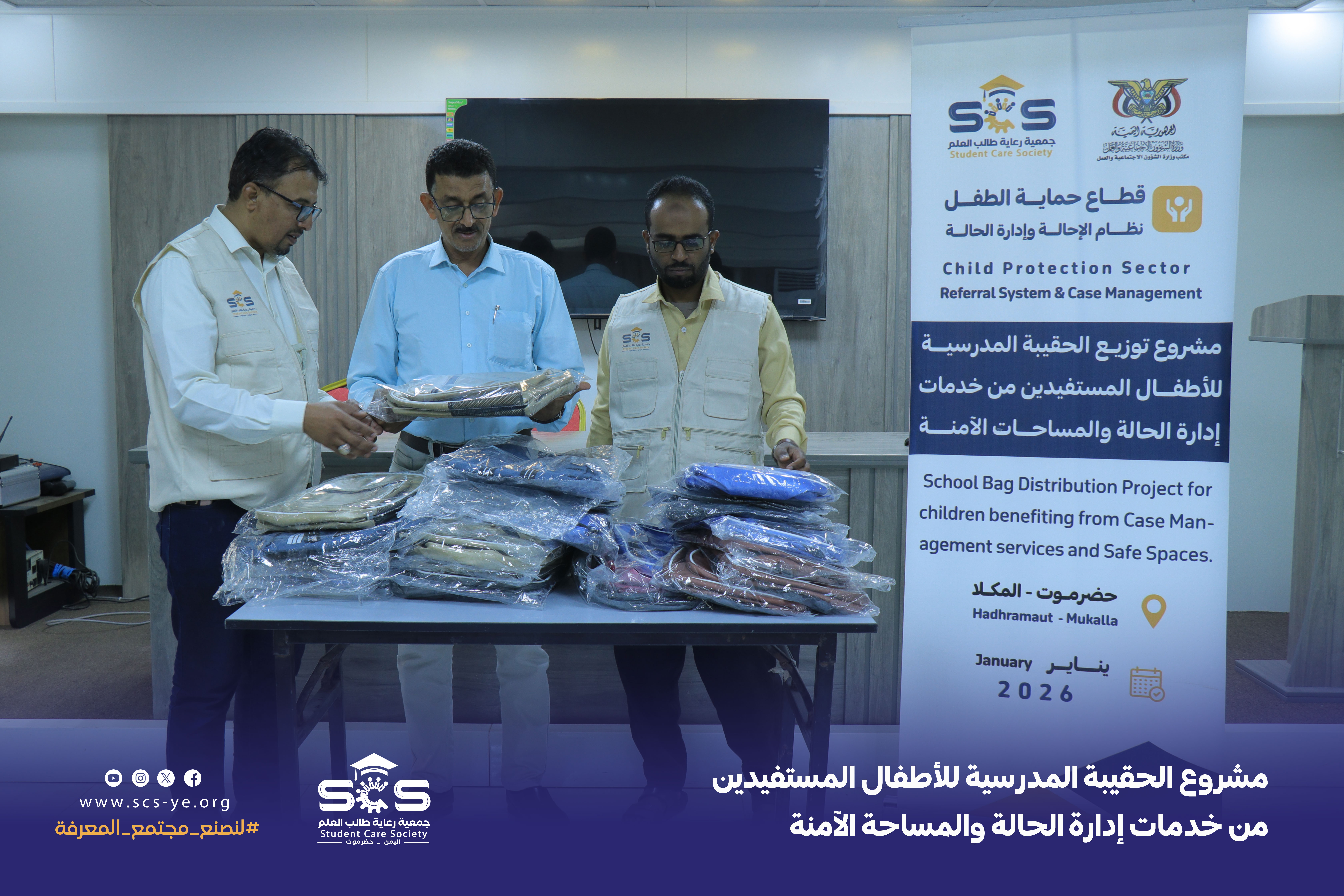نفذت جمعية رعاية طالب العلم مشروع توزيع الحقيبة المدرسية للأطفال المستفيدين من خدمات إدارة الحالة والمساحة الآمنة بمدينة المكلا، جاء المشروع استجابة لندى من إدارة الحالة بمكتب الشوون الاجتماعية والعمل ساحل حضرموت والمساحة الآمنة بمدينة المكلا