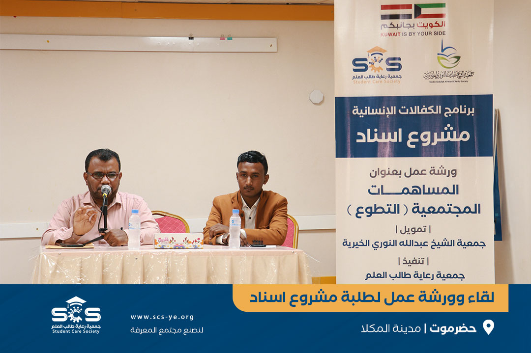 نفذت جمعية رعاية طالب العلم بالمكلا لقاء عام بطلبة مشروع إسناد وورشة عمل بعنوان المساهمات المجتمعية ( التطوع ) للطلاب والطالبات المستهدفين ضمن برنامج الكفالات الإنسانية مشروع إسناد الذي يأتي بتمويل من جمعية الشيخ عبدالله النوري الخيرية بدولة الكويت وتنفيذ جمعية رعاية طالب العلم بالمكلا للطلبة بمدينة المكلا