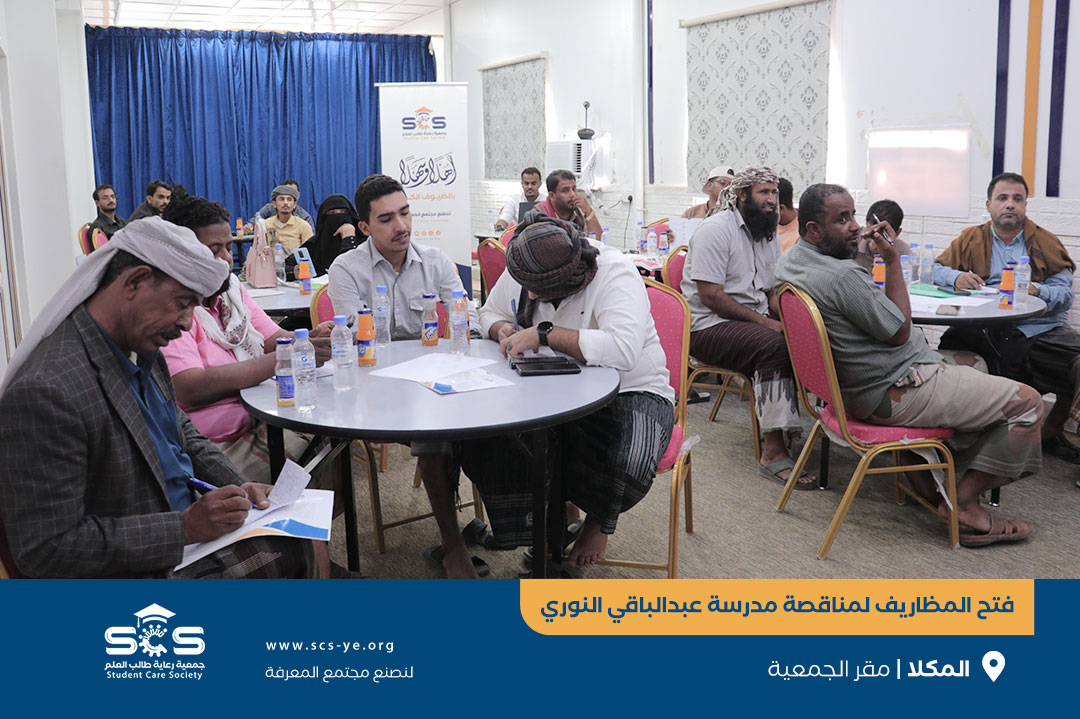 جرى بقاعة جمعية رعاية طالب العلم بالمكلا فتح مظاريف مناقصة إنشاء مدرسة وقف عبدالباقي النوري - يرحمه الله بمحافظة شبوة عتق منطقة صدر باراس الممولة من جمعية الشيخ عبدالله النوري وتنفيذ جمعية رعاية طالب العلم.