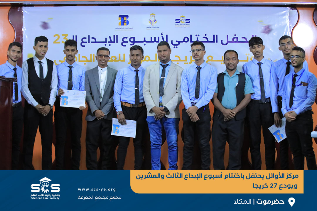 احتفل مركز الأوائل الجامعي للتنمية التابع لجمعية رعاية طالب العلم، بالمكلا، باختتام أسبوع الإبداع الثالث والعشرين تحت شعار "بروح الشباب نجتاز التحديات"، وودع المركز 27 خريجاً من طلابه.