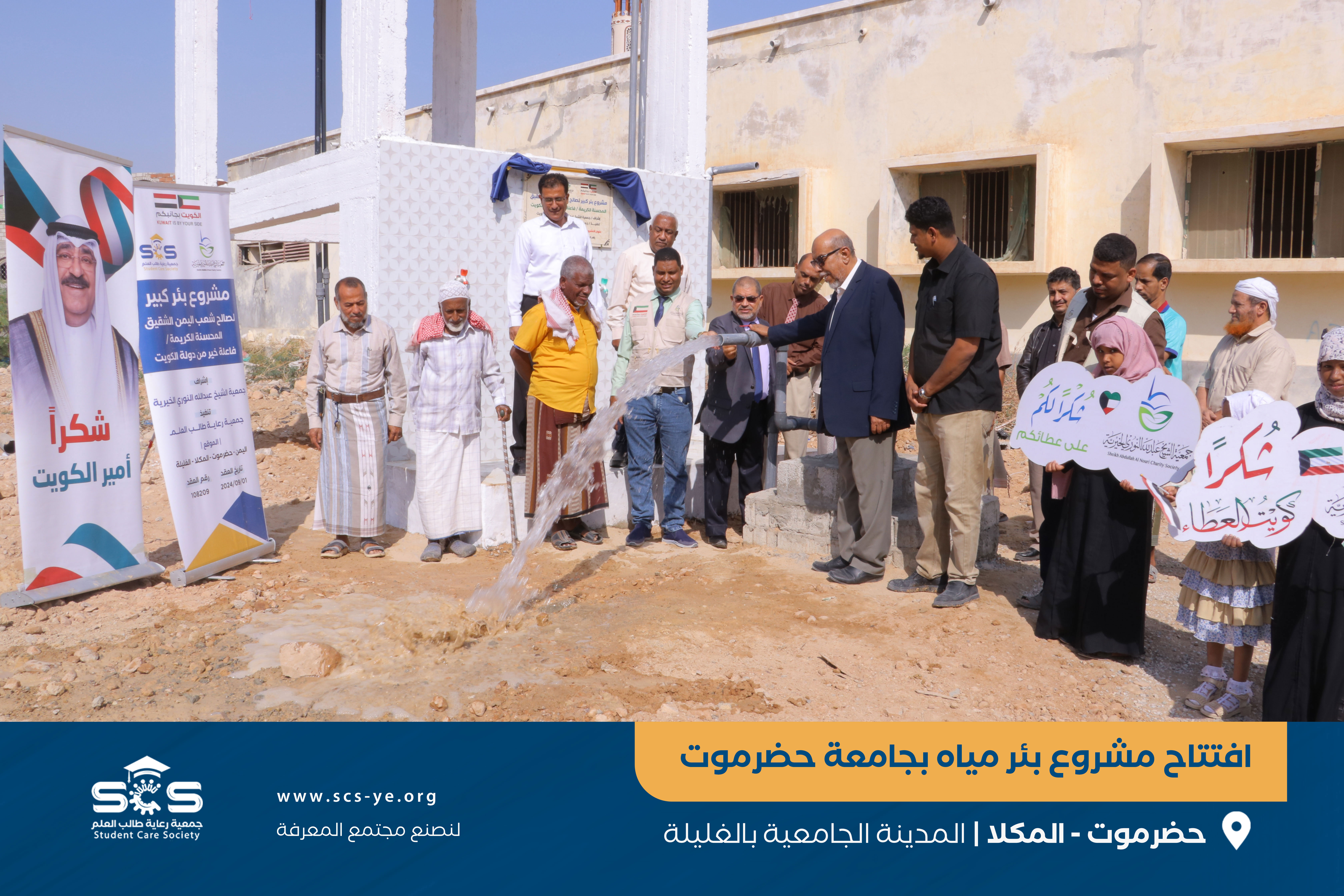 وفي حفل الافتتاح، أعرب رئيس جامعة حضرموت، الأستاذ الدكتور محمد سعيد خنبش، عن شكره وتقديره لدولة الكويت على دعمها المستمر، مشيداً بدور جمعية رعاية طالب العلم في تنفيذ مشاريعها التي تخدم التعليم الجامعي. وأوضح الدكتور خنبش أن المشروع يمثل خطوة مهمة لتلبية احتياجات المياه في الجامعة، مما يعكس الأثر الإيجابي للتعاون بين الجهات الداعمة والمؤسسات التعليمية.