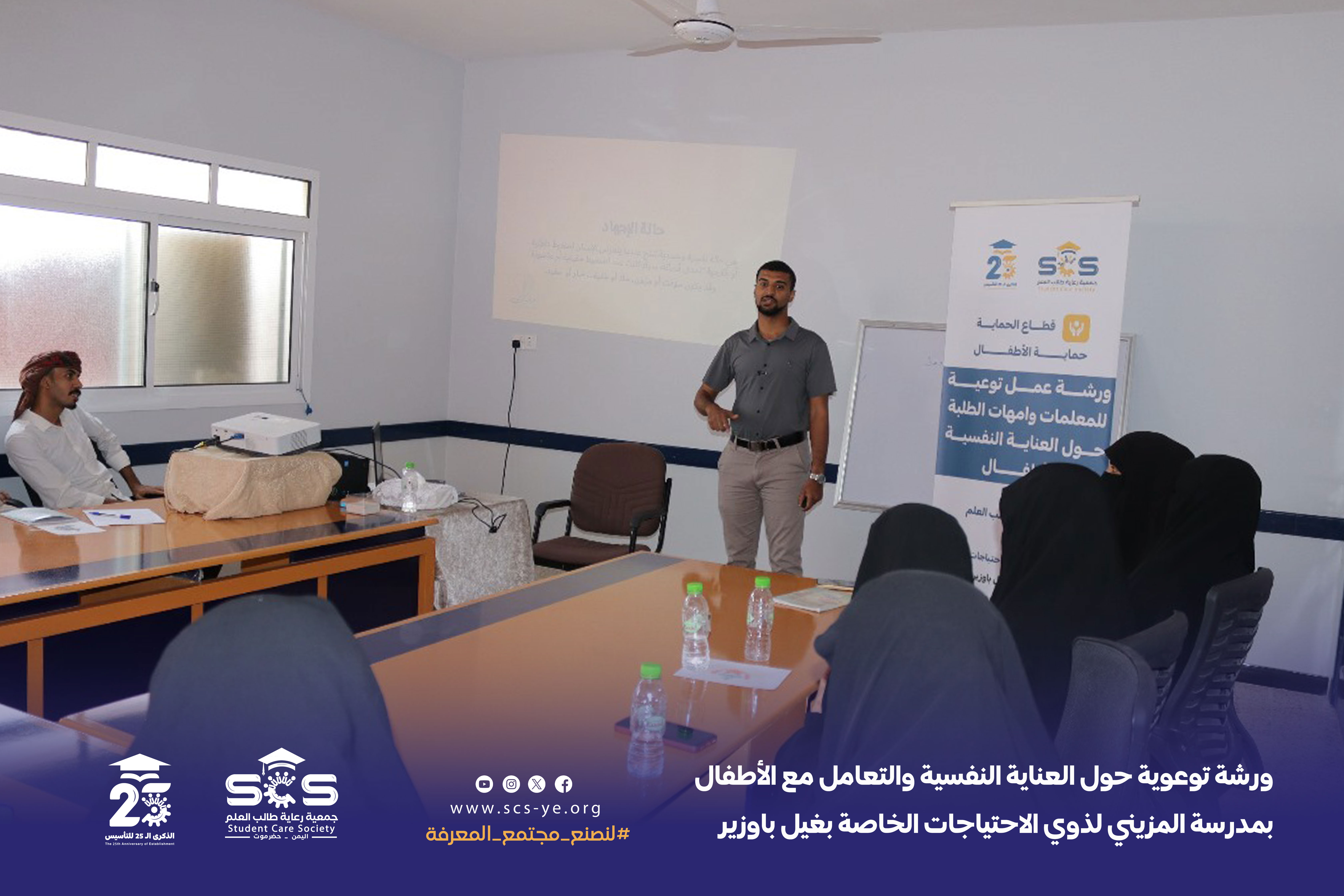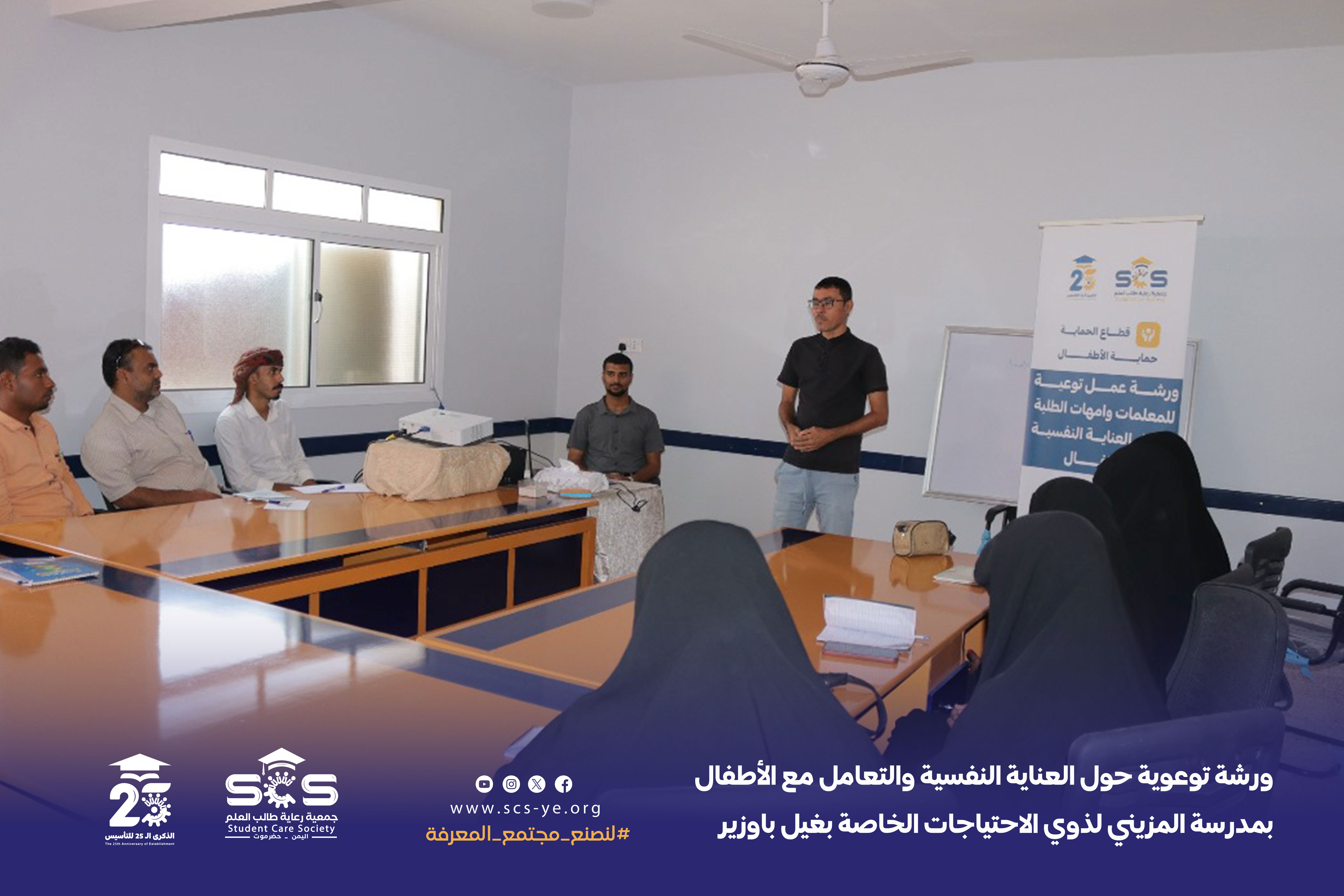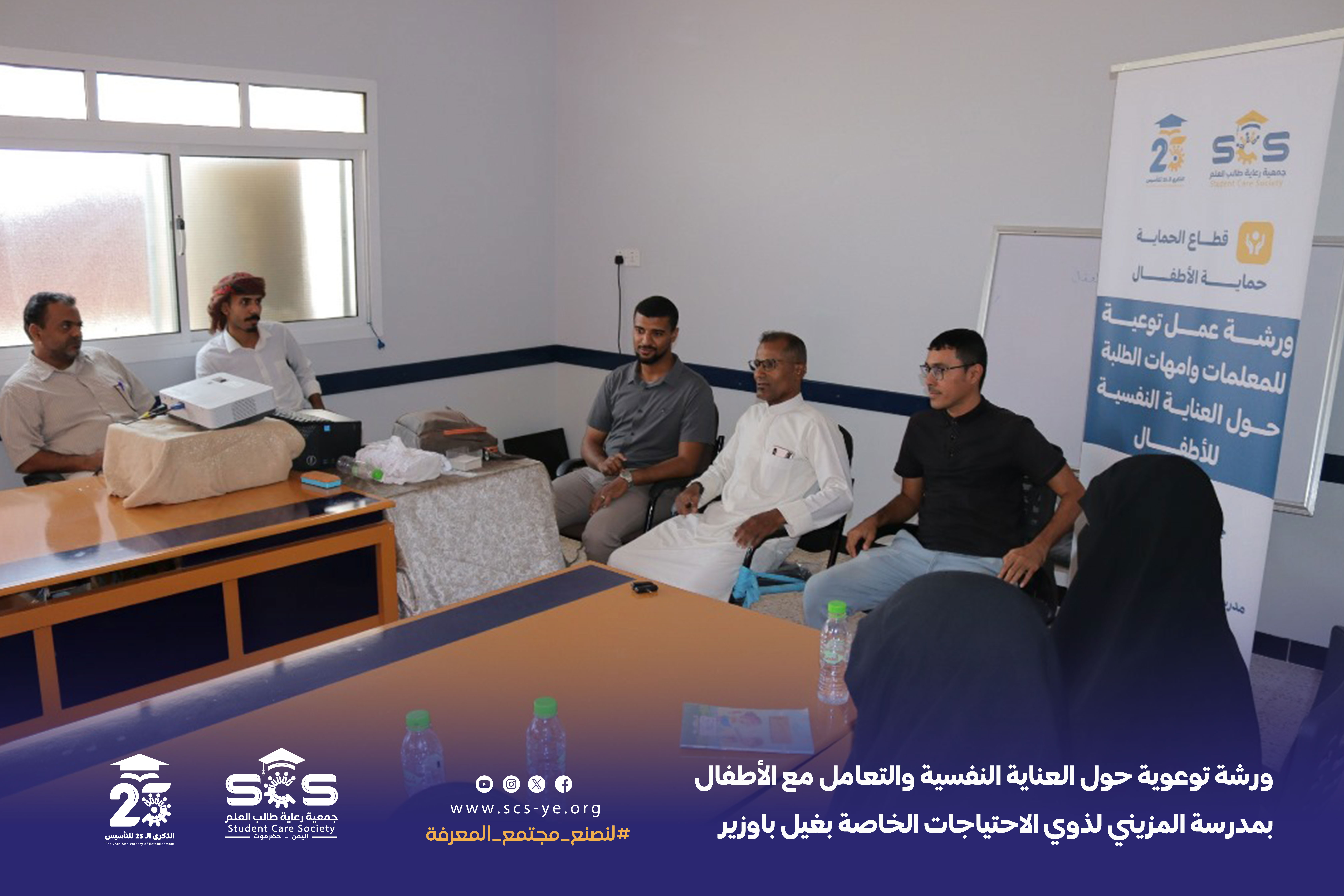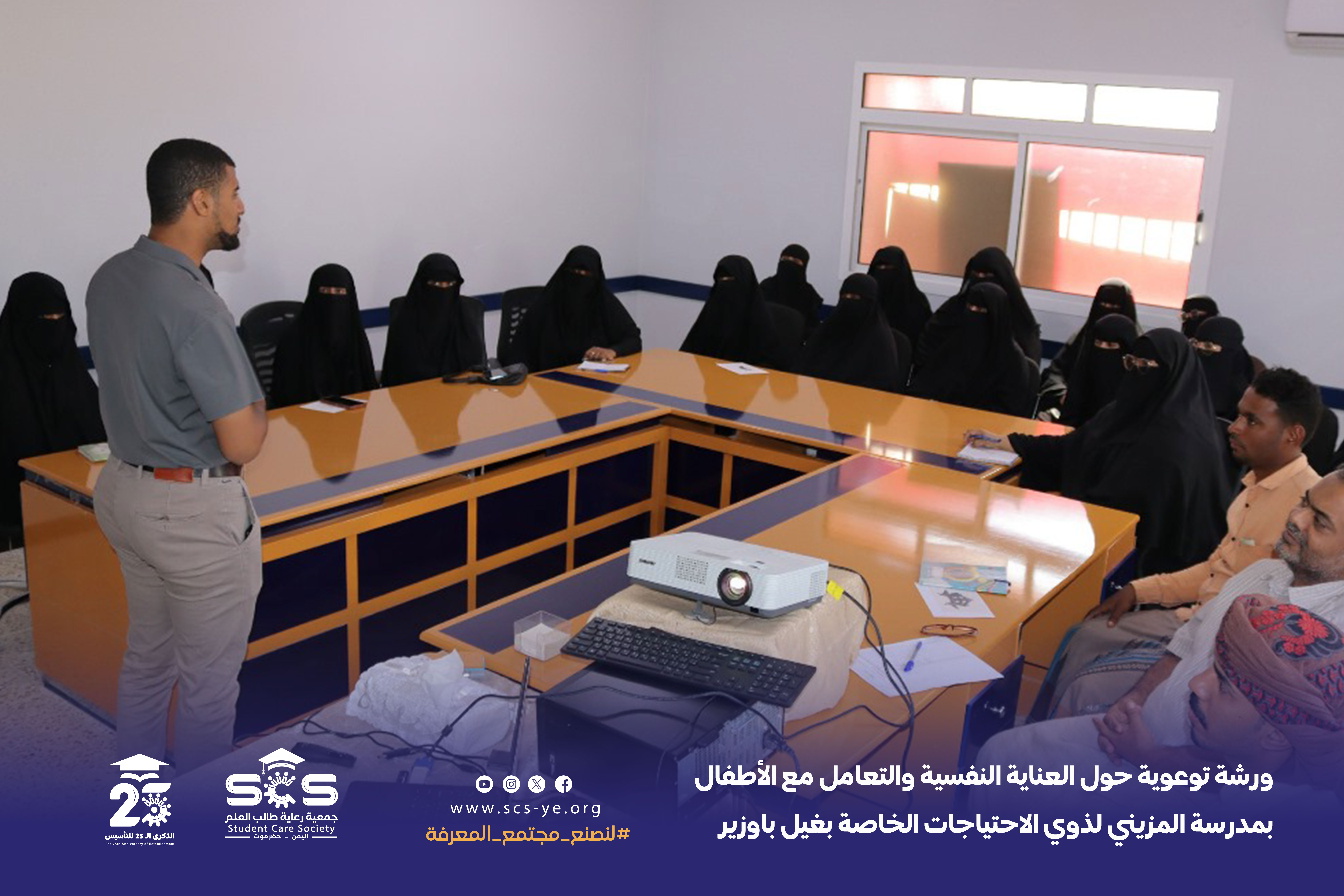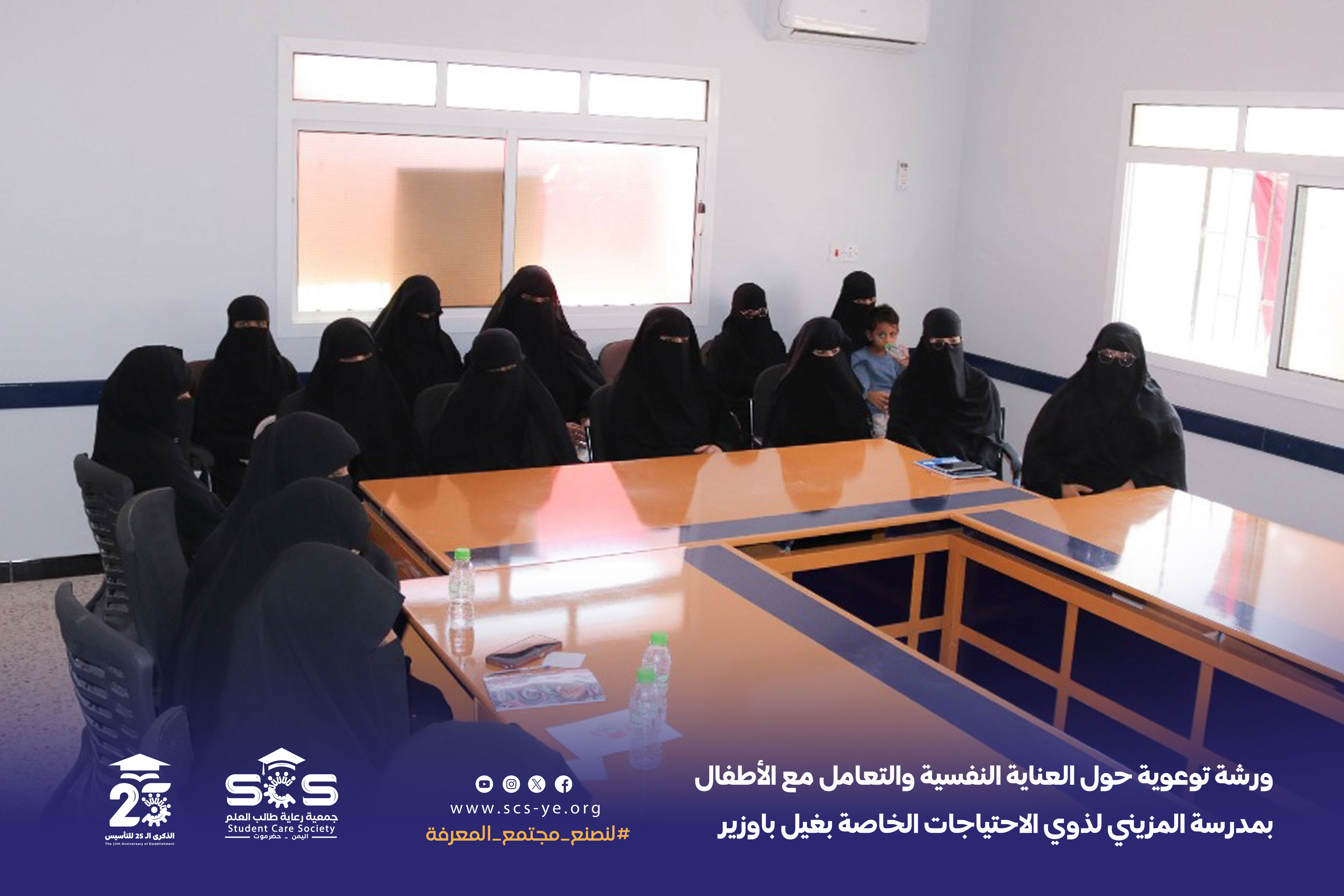 نظمت جمعية رعاية طالب العلم ورشة توعوية حول العناية النفسية والتعامل مع الأطفال بمدرسة المزيني التعليمية لذوي الاحتياجات الخاصة بغيل باوزير، التي أنشأتها جمعية رعاية طالب العلم عام 2024، بمشاركة 24 من المربين والمربيات وأمهات الطلبة.