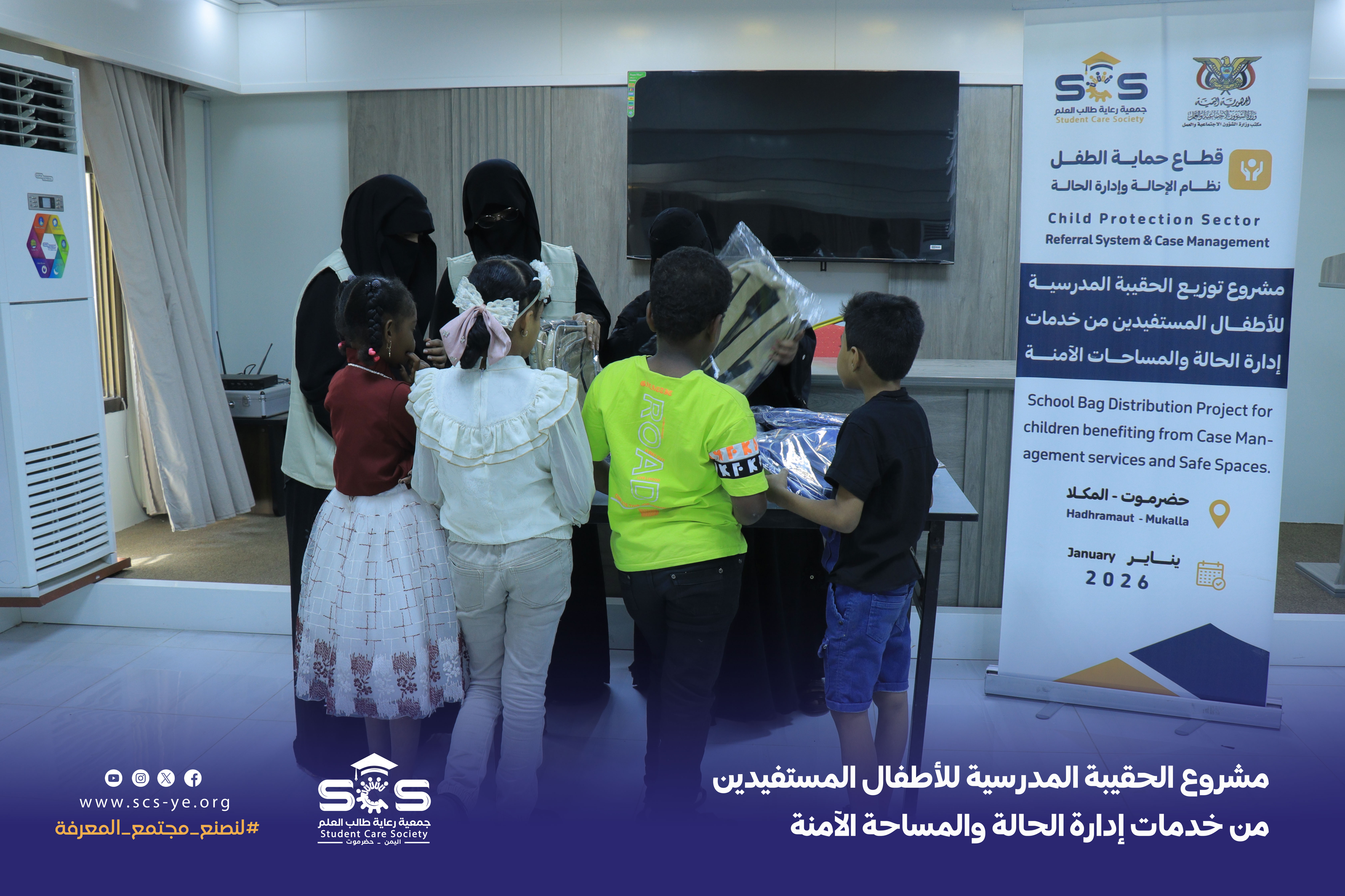 نفذت جمعية رعاية طالب العلم مشروع توزيع الحقيبة المدرسية للأطفال المستفيدين من خدمات إدارة الحالة والمساحة الآمنة بمدينة المكلا، جاء المشروع استجابة لندى من إدارة الحالة بمكتب الشوون الاجتماعية والعمل ساحل حضرموت والمساحة الآمنة بمدينة المكلا